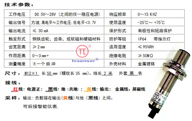 采用新型磁敏感元件,钢铁材质导磁体触发,具有频响宽,稳定性好,抗干扰能力强,坚固耐用。内有放大整形电路,零转速起测,最大频率达15KHZ以上,输出方波电压信号,幅度稳定,可远距离传输。 *** 性价比佳 的 转速传感器。