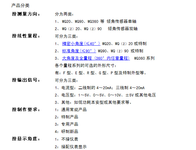 采用国际先进的磁敏感元件,参照大地水平面,巧妙利用重力摆结构,精密的无电触点设计,测量出相对大地水平面的倾斜角度或垂直角度,线性输出标准的电信号。量程全 0~360°之间任一量程均可。