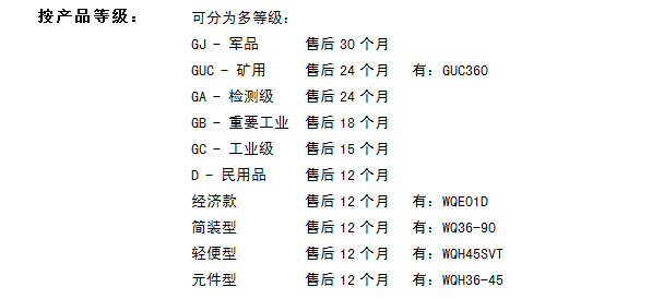 ① 多梯次等级:军品级-GJ;矿用-GUC;高级检测级-GA;重要工业级-GB;工业-GC,民品级:D