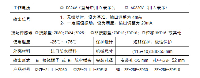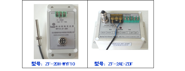 由振动变送器与振动传感器组成。振动传感器测量和采集的动态振动电信号输入到振动变送仪,经精密集成放大电路处理,并经标准振动发生仪发出的实际振动信号来标定。在一定振动频率下,相对应的振动强度(位移,速度或加速度),输出标准的4-20mA电流信号;同时还可输出动态振动波形信号以及主频频率信号。