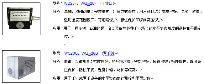 WQ20 WQ(2)20 系列:采用国际先进的高性能磁敏感技术制作的精密小角度倾角传感器。它可以无触点的测量(单/双轴)倾斜角度和水平姿态,经过处理输出标准电信号。具有动态响应快,信号灵敏可靠。不同的产品,可应用于不同的设备和场合。