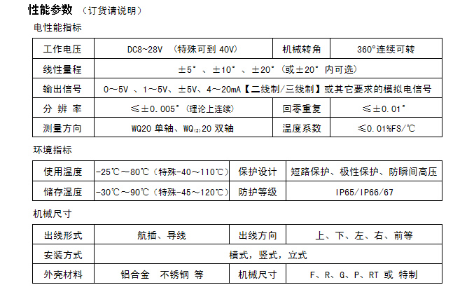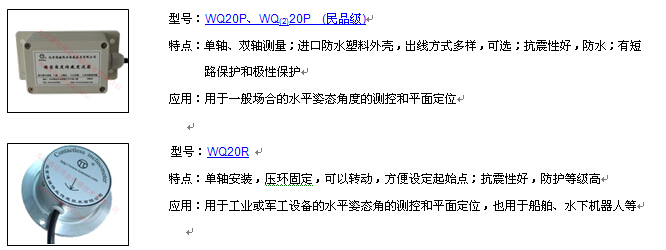 *WQ20R单轴 该型号具有各类保护和补偿,可靠性高,适用温度范围广。圆形设计,压环安装,方便设置起测点。常用于船舶 摆臂装置等。